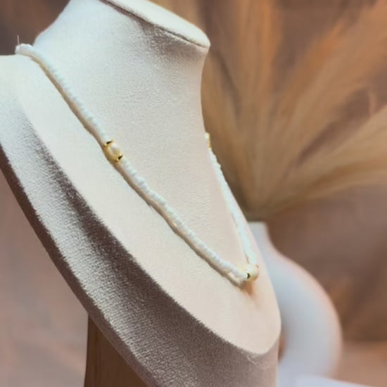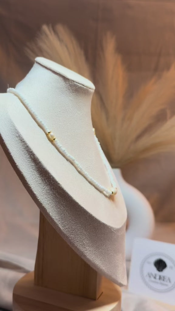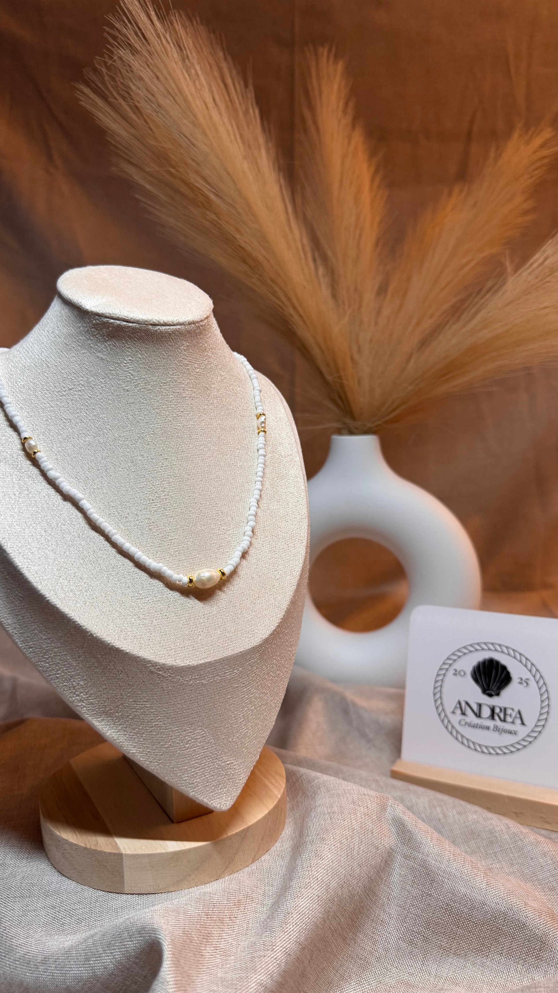 Le collier Élégance Marine allie simplicité et raffinement grâce à ses perles blanches délicates et son éclat subtil doré. Sa perle centrale, légèrement plus imposante, rappelle la pureté des trésors marins et apporte une touche intemporelle. Léger et raffiné, il se porte aussi bien au quotidien que lors d'occasions spéciales, sublimant chaque tenue d'une élégance naturelle et discrète.