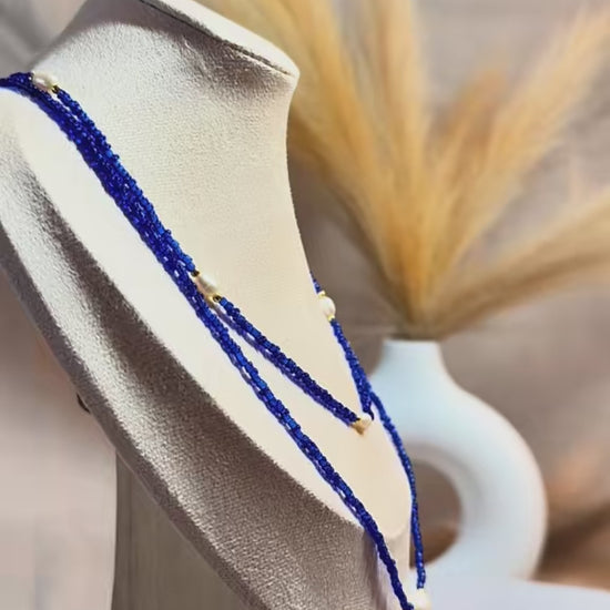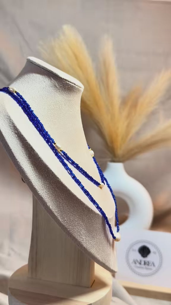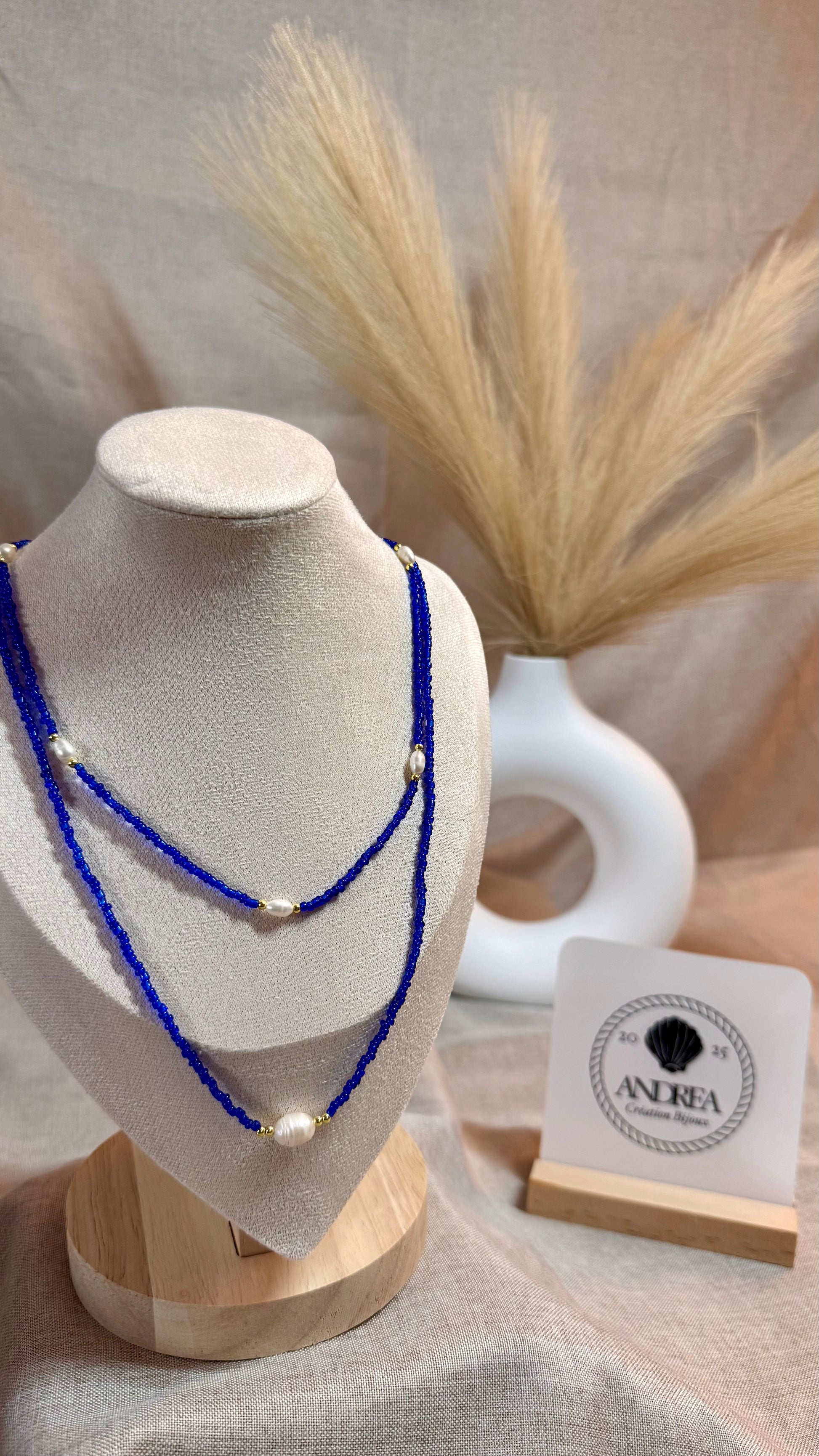 Comme des gouttes de ciel glissant sur la peau, Larmes d'Azur mêle le bleu profond à la pureté nacrée pour créer un bijou à la fois délicat et vibrant. Chaque perle semble suspendue dans le temps, porteuse d'un éclat doux et rêveur.